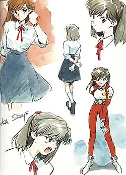 Первоначально заглавным персонажем должна была стать девушка, рядом с которой будет героиня с характером старшей сестры. Все это структурно должно было напоминать Gunbuster. В ответ на эти запросы Садамото создал дизайн похожей на Аску героини. Предполагалось что она займёт положение «идола», а её отношения с Синдзи будут формироваться по типу отношений Жана и Нади из Nadia: The Secret of Blue Water. Тем не менее после Gunbuster и Nadia Садамото уже не слишком нравилась идея делать главного персонажа девушкой. Поэтому, раз уж работы велись над меха-аниме, Садамото предложил сделать главного героя мальчиком. Примерно в то же время Садамото узнал о нерве A10 и предложил идею «о мёртвых матерях внутри боевых роботов». В результате старые наработки были полностью отброшены и остались лишь в черновиках.[28]
