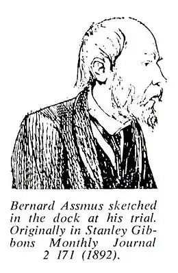 Ассмус был родом из Гамбурга и работал в Лондоне. Он был разоблачён после того, как Моррис Гивелб приобрёл у него поддельные служебные марки VR в августе 1890 года[2][3]. Гивелб сопровождал полицию во время посещения помещений Ассмуса на Черч-стрит, 12 в Ислингтоне и помогал полиции в полицейском участке на Винной улице сортировать изъятые во время обыска материалы[3].