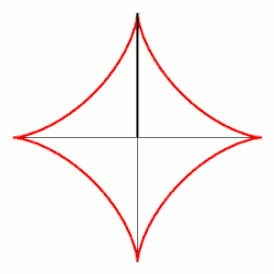 - ↑ Уравнение в прямоугольных координатах следует из параметрического уравнения и основного тригонометрического тождества. Вывод параметрического уравнения такой. Возьмём уравнение гипоциклоиды, подставим k=4. Синус/косинус тройного угла разложим по формуле синуса/косинуса суммы, то же для синуса/косинуса двойного угла. Учтём R=4r и получим наши уравнения.