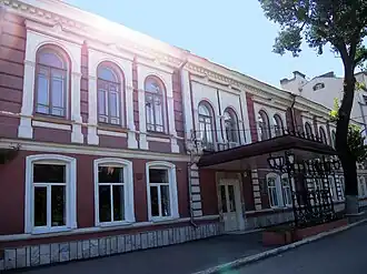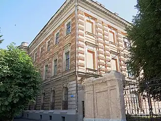 Старинный двухэтажный жилой дом, фасад, выходящий на улицу, обильно украшен лепниной: пилястрами по бокам и прямыми сандриками над окнами[7]