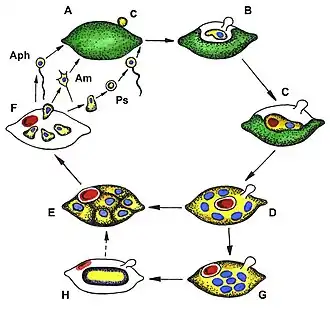 Генерализованная схема жизненного цикла 3 родов афелид: Aphelidium (Aph), Amoeboaphelidium (Am) и Pseudaphelidium (Ps). A — контакт зооспоры с поверхностью клетки хозяина, B — внедрение в клеку хозяина, C — амебоидный паразит с ядром (обозначено синим) и остаточным телом (обозначено красным) питается содержимым клетки хозяина, D — многоядерный плазмодий занимает все пространство хозяйской клетки, E — деление плазмодия на одноядерные клетки, F — зрелые зооспоры покидают клетку хозяина, G — стадия, предворяющая формирование покоящийся споры, H — покоящаяся спора.