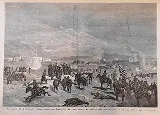 - в) подполковника Гайдарова (4 ½ роты, 2 команды, 1 ½ сотни, 4 орудия, 5 ракетных станка и 1 гелиографный, производящий демонстративную атаку) должна деятельно содействовать двум первым, для чего овладеть Мельничною калою и ближайшими ретраншаментами, действовать усиленным ружейным и артиллерийским огнём по внутреннему пространству цитадели.
