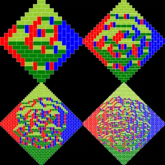 Примеры типичных случайных разбиений ацтекских бриллиантов порядков, 10, 15, 25 и 40, раскрашенных соответственно стандартной нотации плиток. Форма области с хаотичным поведением стремится к вписанному кругу.