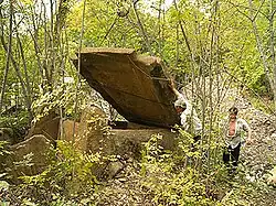 Восстановление А. Д. Резепкиным при помощи автокрана скинутого вандалами-лесозаготовителями перекрытия дольмена 39-2 (курган 39, погребение 2). Клады