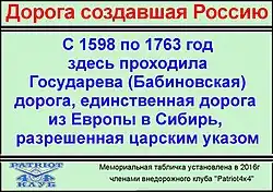 - ↑ Государева Бабиновская дорога 2016 - Форум Клуба PATRIOT 4x4 (англ.). www.patriot4x4.ru. Дата обращения: 3 октября 2018. Архивировано из оригинала 3 октября 2018 года.