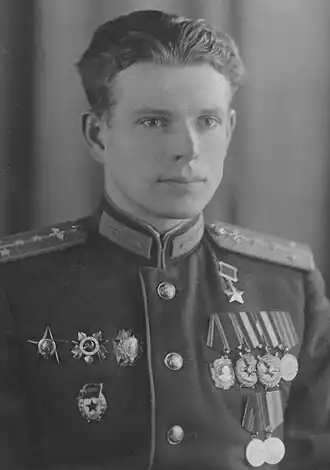 - ↑ Указ Президиума Верховного Совета СССР «О присвоении звания Героя Советского Союза офицерскому составу военно-воздушных сил Красной Армии» от 4 февраля 1944 года // Ведомости Верховного Совета Союза Советских Социалистических Республик : газета. — 1944. — 17 февраля (№ 10 (270)). — С. 1. Архивировано 8 марта 2022 года.