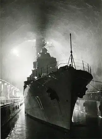 ![]() Эсминец ВМС Швеции «Сандсваль» входит в туннель базы Мускё | |