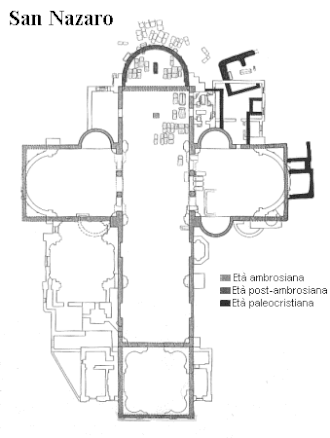 В 395 или в 396 году по древнему преданию епископ Амвросий обрёл мощи Святого Назария (возможно также частицы мощей апостолов Иоанна, Андрея и Фомы) и перенёс их в базилику; тело святого было помещено в подземной нише (где в 1579 году его обнаружил святой Карл Борромео, перенеся в новый алтарь, перестроенный в 1567 году). Изначально прямоугольная восточная апсида была расширена до полукруглой согласно требованиям Тридентского собора[5]. В документе 777 года церковь уже упоминалась как Сан-Надзаро[6]. В V веке вокруг апостольского алтаря в каменных саркофагах были помещены тела некоторых миланских епископов, преемников святого Амвросия, чтобы укрепить связь между миланской епископальной властью и апостолами. В последующие века, вплоть до раннего Средневековья, в базилике установилась традиция погребения епископов[7].