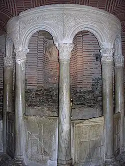 Фронтоны арок были украшены плитами из тёмно-голубого или зеленоватого мрамора, а в их внутренней части имелся геометрический орнамент со вставками из белого, чёрного и красного мрамора[23]. В настоящее время украшения на колоннаде практически отсутствуют, их внешний вид известен только по рисункам, сделанным в начале XX века.