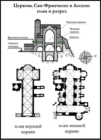 Оба яруса представляют собой однонефные базилики с трансептом. План нижней церкви усложнён многочисленными капеллами и криптами. Из церкви можно спуститься ещё ниже — в крипту, где погребён Св. Франциск. У южного фасада церкви возвышается 60-метровая колокольня. Контрфорсы и аркбутаны, обрамляющие здание, видны с северного фасада, а со стороны Нижней площади теряются между колокольней и вспомогательными сооружениями.