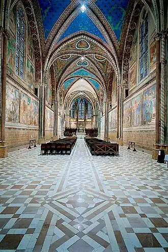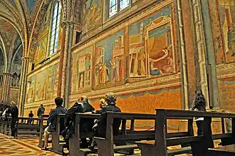 Создание знаменитого фрескового цикла церкви заняло более полутора веков. Художники начали с росписи стен Нижней базилики (мастер святого Франциска, Чимабуэ), чтобы затем переключиться на украшение стен Верхней (Чимабуэ, Джотто). Закончив работы в Верхней церкви, мастера вернулись в Нижнюю церковь и пристроенные к ней новые капеллы (Джотто, Симоне Мартини, Пьетро Лоренцетти).