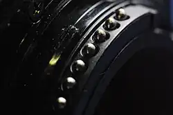 - AF — исходное обозначение объективов с автофокусом. С оправы автофокусных объективов исчезла вилка соединения диафрагмы с экспонометром. Ранние объективы с таким обозначением оснащены полумуфтой так называемого «отвёрточного» автофокуса, соединявшей его привод, расположенный в фотоаппарате, с кольцом фокусировки. Появление этой полумуфты стало дальнейшим усовершенствованием байонета F, и её расположение в нижней части фланца стандартизировано, хотя в современных объективах она отсутствует. Кроме того, все объективы серии AF обладают встроенным микропроцессором, поэтому байонет F был дополнен пятью электрическими контактами, передающими в объектив электропитание, а обратно — данные с органов управления[19]. Экспоавтоматика многих современных камер работоспособна только с такими «компьютеризированными» объективами. Более старые объективы могут быть использованы с применением специального переходника типа «одуванчик». С дальнейшим совершенствованием системы Nikon количество контактов байонета возрастало и в современных образцах может достигать десяти. Первоначальные размеры и расположение контактов, а также их конструкция в 1984 году защищены патентом США 4,457,609[20]. В 1990 году выдан патент 4,896,181 в котором распределены функции пятиконтактного интерфейса Nikon. Контактная группа камеры располагается в верхней части байонета под пентапризмой и состоит из плоских контактов. Контакты объектива подпружинены и расположены в специальном приливе корпуса оправы[19]. Такое расположение обратно конструкции байонета Canon EF: в последнем подпружинены контакты камеры, расположенные в нижней части под зеркалом.