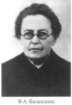 Точная дата смерти В. А. Баландиной до сих пор документально не подтверждена: 1943 или 1945. По информации её внучки — Нины Алексеевны, Баландина умерла 3 ноября 1943 года[4]. Похоронена в Казани.