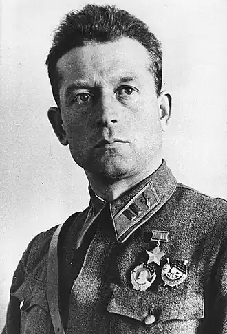 - ↑ Должность и воинское звание приведены на дату представления к присвоению звания Героя Советского Союза.