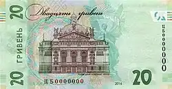 - ↑ В 2004 году была отпечатана и введена в обращение новая банкнота в серо-зелёных и розоватых тонах, однако почти сразу от угрюмого серого тона было решено избавиться, заменив его на национальные жёлтые и синие цвета, без изменения рисунка. Новая сине-желтая гривна появилась в 2006 году