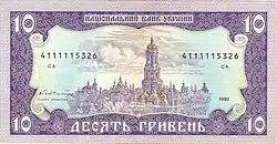 - ↑ В августе 2006 года в обращение была введена банкнота номиналом 10 гривен образца 2004 года (2006 года выпуска) с отдельными изменёнными цветами дизайна (в частности, цвет портрета Ивана Мазепы изменён с вишнёво-коричневого на тёмно-серый) и указанием нового года выпуска — 2006