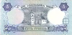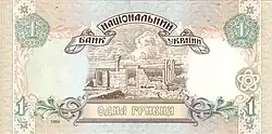 На оборотной стороне банкнот в центре размещены изображения историко-архитектурных памятников Украины, сверху над которыми сделана надпись «Национальный банк Украины». Словами и в четырёх углах цифрами обозначена номинальная стоимость банкнот, а снизу — и год утверждения образца банкнот. Дизайн банкноты дополняют розетки, ленты и орнаменты, выполненные многоцветной печатью.