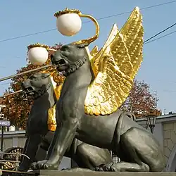 Особую известность мосту принесли угловые скульптуры крылатых львов (часто ошибочно именуемых грифонами) работы скульптора П. П. Соколова[8]. Мифические крылатые львы, изображения которых ранее встречались только в отделке мебели и архитектурных деталях, впервые были отлиты в огромных размерах и украсили улицу[1]. Работа над созданием моделей с мая по сентябрь 1825 года, также скульптором были изготовлены алебастровые формы[1]. Скульптуру предполагалось чеканить из медных листов, но затем фигуры (высотой в 2,85 м) отлили из чугуна на Александровском чугунолитейном заводе. Крылья грифонов были отчеканены из листовой меди и покрыты сусальным золотом[1][11].
