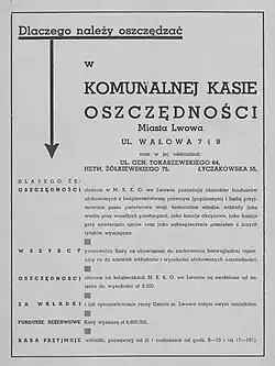Также в этот период во Львове действовали «Государственный земледельческий банк» (улица Пилсудского, 25, нынешняя улица Франко), «Варшавский торговый банк» (улица Гетманская, 10), «Варшавский дисконтный банк» (улица 3-го Мая, 14), «Польский банк» (улица Мицкевича, 8), «Польский гарантийный банк» (улица 3-го Мая, 11), «Лодзьский депозитный банк» (улица 3-го Мая, 5), «Купеческий кооперативный банк» (улица Гетманская, 8), «Центральный кооперативный банк» (пассаж Гаусмана, 7, нынешний проезд Кривая Липа), «Кооперативный банк для мелкой торговли» (улица Легионов, 27, нынешний проспект Свободы), «Краевой кооперативный банк» (улица Ризницкая, 16, нынешняя улица Наливайко), «Концессионный кооперативный банк» (улица Браеровская, 14), «Кооперативный промышленный банк» (улица Гродзицких, 1, нынешняя улица Печатная), банк «Днестр» (улица Русская, 20), «Поветная сберегательная касса» (улица Мохнацкого, 4, нынешняя улица Драгоманова), «Почтовая сберегательная касса» (улица 3-го Мая, 9), «Ипотечный банк» (площадь Галицкая, 15), «Нефтяной банк» (улица Сапеги, 3, нынешняя улица Бандеры), «Общий банк союзов» (улица Ягеллонская, 2), «Общий кредитный банк» (улица Ягеллонская, 5—7), «Банк краевого хозяйства» (улица Костюшко, 11) и «Банк землевладельцев» (улица Коперника, 20)[90][62].
