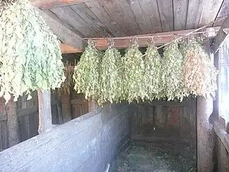 Вначале ветки связывают неплотно. Вешают на жерди или растянутую верёвку под навес, так, чтобы не попадал прямой солнечный свет, там, где есть хороший сквозняк. Через 6—7 дней, когда веники хорошо высохнут, их плотно связывают и плотно укладывают на стеллажи в сухом предбаннике, сарае или другом сухом и хорошо проветриваемом помещении.