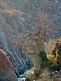 Дерево высотой 10—15 (до 25) м с диаметром ствола до 8—10 м. Корневая система мощная, с толстыми узловатым корнями, простирающимися на десятки (до 50) метров по поверхности почвы и на глубину около 2 м[5]. Кора розоватая, серая или красновато-коричневая, гладкая.