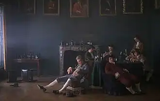 Постоянное удаление камеры от действующих лиц отгораживает зрителя от происходящего на экране, подчёркивает механистичность ритуалов, которые не только управляют жизнью героев фильма, но и делают их своими пленниками[16]. В обычном смысле слова жизнь этих персонажей полна абсурда[16]. Вопиющее несоответствие между смыслом происходящего и формой безупречного этикета, в которую облечён этот смысл, чувствуется в объяснении Барри с сэром Чарльзом, в сцене визита посыльного Булингдона к Барри и его матери, в сцене бракосочетания.