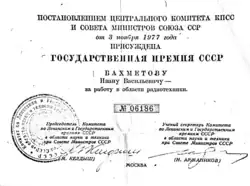В 1977 году в составе авторского коллектива И. В. Бахметову была присуждена Государственная премия СССР за работу в области развития средств Радиоэлектронной борьбы ВВС СССР.