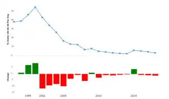 С 2008 по 2013 год уровень бедности на Украине то немного возрастал, то снижался. Его максимальное значение (25,8%) было зафиксировано в 2011 году. Резкий рост бедности произошёл после аннексии Крыма и начала войны на Донбассе. В 2014 году уровень бедности составил 28,6%, а уже в следующем году он удвоился — до 58,3%. В 2016 году показатель достиг 58,6%. После пика в 2015–2016 годах бедность начала снижаться: 2017 — 47,3%, 2018 — 43,2%, 2019 — 37,8%[5].