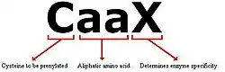Мотив пренилирования, известный как CAAX-бокс — наиболее популярный сайт пренилирования белков, то есть сайт, к которому ковалентно прикрепляются фарнезил или геранилгеранил[2][3]. В CAAX-боксе С — это пренилируемый остаток цистеина, А — алифатический аминокислотный остаток и Х определяет, какой тип пренилирования будет иметь место. Если Х — это Ala, Met, Ser или Gln, то белок будет фарнезилирован при помощи фермента фарнезилтрансферазы, а если Х — это Leu, то белок будет геранилгеранилирован ферментом геранилгеранилтрансферазой I[3][4]. Эти ферменты схожи и оба состоят из двух субъединиц[6].