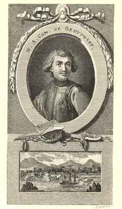 - ↑ Полное родное имя на словацком языке: Matúš Móric Michal František Serafín August Beňovský; на венгерском: Benyovszky Máté Móricz Mihály Ferenc Szerafin Ágost (Беньовски Мате Мориц Михал Ференц Серафин Агошт). В литературе также упоминается как граф Мориц де Беньовски, Gróf de Benyovszky. В русскоязычной литературе он именовался как с полным -ий окончанием (Бениовский, Беньовский, Беньёвский, Бенёвский), так и с польскоязычным, неполным: Бенёвски.