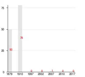 Число жителей по семейным спискам 1879 г.: 20 м. п., 30 ж. п.; по приходским сведениям 1879 г.: 17 м. п., 27 ж. п.[3]