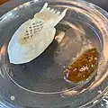 На то, чтобы напечатать одного кальмара, уходит 17 минут. Потом его обжаривают на сковороде, чтобы белок начал работать. И уже на тарелке перед гостем поливают маслом, настоянным на петрушке.