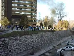 Митинги в Сараеве начались 7 февраля. Полицейские применили против митингующих слезоточивый газ и резиновые пули, однако несколько тысяч протестующих прорвались в здание правительства и подожгли его[48].