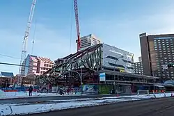 Библиотека Стэнли А. Милнера - самая большая и одна из самых загруженных публичных библиотек Эдмонтона . Зданию было уже более 50 лет, и оно уже не полностью удовлетворяет запросы современной библиотеки. Как это часто бывает со многими бруталистскими зданиями Эдмонтона той эпохи, открытый бетон и другие материалы в библиотеке начали разрушаться из-за долгих лет выветривания. Ощутимо старение конструкций систем жизнеобеспечения: проблемы с вентиляцией и потерь тепла. Кроме того, возникли проблемы с безопасностью в отношении парадного входа в библиотеку, выходящего на Черчилль-сквер.[13] Узкий тротуар и оживленная автобусная остановка прямо у входа на 102 Avenue привели к множеству пробок и проблем с безопасностью.