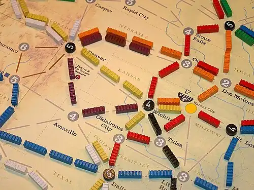 Заплатив за постройку, игрок выставляет фишки «Вагон» своего цвета на поле, помечая таким образом построенную им дорогу.