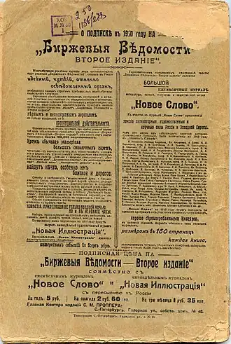 - ↑ Енгалычева Е. А. Дмитрий Линев и второе издание "Биржевых ведомостей"/ Петербург газетный: 1711—1917 // сост. Е. С. Сонина. Тюмень, 2009. С.226.