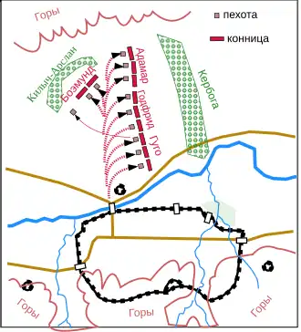 - Немалое значение имело и правильное решение Боэмунда атаковать из ворот Моста, поскольку прочим отрядам Кербоги для атаки требовалось перейти реку[53].