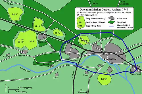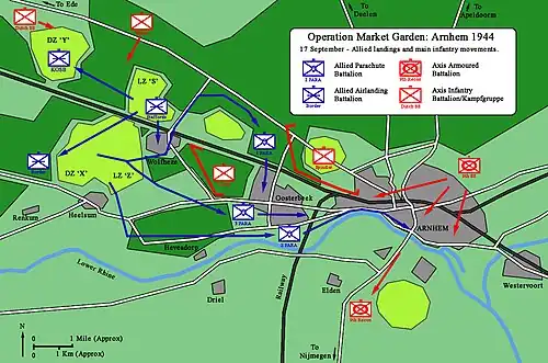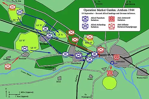 Уркварт решил в первый день операции отправить 1-ю парашютную бригаду под командованием Джеральда Латбери и 1-ю воздушно-десантную бригаду под командованием Филиппа Хикса[12]. Бригада Хикса с артиллерией, инженерным и медицинским корпусами должна была приземлиться в зонах посадки «S» и «Z» и обеспечить безопасность остальных посадочных зон. Три батальона парашютной бригады Латбери должны были приземлиться в зоне выброски «X» и тремя отдельными группами захватить мосты[13]. 2-й парашютный батальон под командованием подполковника Джона Фроста должен был проследовать вдоль реки к центру Арнема и захватить автомобильный и железнодорожный мосты, а также понтонный мост между ними. 3-й парашютный батальон подполковника Фитча должен был пройти в Арнем через Остербек, помочь в захвате автомобильного моста и занять позиции на востоке города[13]. 1-й парашютный батальон подполковника Доби должен был проследовать к северу от железнодорожной линии, чтобы занять высоту на севере и северо-западе от Арнема[13]
