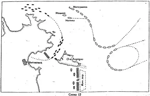Гораздо успешнее больших японских кораблей действовали миноносцы. Хотя китайские мины были выведены из строя, восточный вход в бухту перекрывал протянувшийся на 3 км бон из стальных швартовых, которые поддерживали бревенчатые заякоренные плоты. В боновом заграждении было несколько проходов, которые, однако, охраняли китайские дозорные суда. Южный участок бона был уже разрушен японцами, но этот проход у берега был опасным из-за обилия подводных скал.