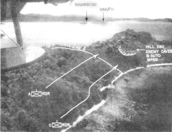 Морские пехотинцы смогли установить два пулемёта Браунинга, которыми они стали подавлять огонь из пещер Гавуту, что позволило продолжить высадку и продвинуться вглубь острова. Ожидая прикрытие, морские пехотинцы рассредоточились и в скором времени их положение стало критическим. Капитан Джордж Стэллингс, командовавший батальоном, приказал морским пехотинцам начать плотный огонь пулемётов и миномётов по позициям японских пулемётчиков на Танамбого. Вскоре американские пикирующие бомбардировщики сбросили несколько бомб на Танамбого, уменьшив интенсивность огня с этого острова.[36]
