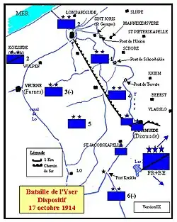 Выполняя план Шлиффена, германская армия в августе 1914 года вторглась в Бельгию. Бельгийская армия отступила в Антверпен, и выдержала там полумесячную осаду. В начале октября бельгийская армия по понтонным мостам покинула Антверпен, и после марша по побережью Северного моря заняла оборону вдоль Изера. Бельгийские войска были истощены и почти не имели боеприпасов, поэтому французы отправили им в подкрепление 6.000 морских пехотинцев и пехотную дивизию.