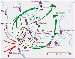 Ночью основные силы монгольского войска во главе с Субэдэем переправились через реку на левом фланге, обойдя венгерский лагерь с юга, другая часть монголов (Батый, Шибан) захватила мост через реку, оттеснив венгерский охранительный отряд. Утром монголы начали обстрел расположенного в долине венгерского лагеря с окружающих холмов из луков и камнемётных машин, затем ворвались в лагерь. Монголы не замкнули кольцо окружения. Венгерское войско обратилось в бегство, монголы постепенно уничтожали его в ходе преследования на протяжении 6 дней и на плечах бегущих ворвались в Пешт.