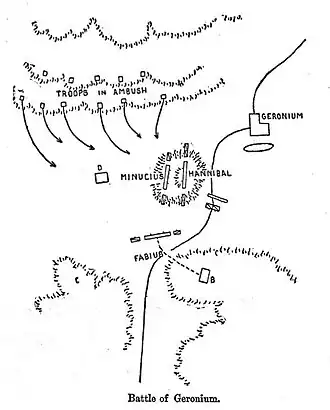 Поутру Ганнибал приказал небольшому отряду занять холм. Минуций приказал атаковать карфагенян на холме. Но сбить их оттуда оказалось непросто, и Минуций подтянул к холму основные силы. Ганнибал тоже подтянул свои основные силы. Завязалось ожесточённое сражение, которое шло с переменным успехом. Но затем Ганнибал ввёл в бой засадный отряд, который атаковал римлян с тыла. Среди римлян началось беспорядочное бегство.