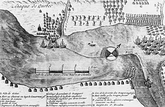 Когда английские посланники прибыли в Квебек для того, чтобы передать французам условия капитуляции города, Фронтенак отказался отдать город и пообещал дать ответ «жерлами орудий»[2]. Майор Джон Уолли командовал вторгшейся английской армией, которая высадилась в районе Бопор. Английские солдаты постоянно подвергались нападениям со стороны канадских ополченцев и были вынуждены отступить. А эскадра военных кораблей под командованием сэра Уильяма Фипса почти полностью была разрушена пушечными выстрелами из города.