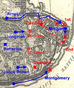 Беспокоясь, что подходивший к концу срок военной службы колонистов ослабит его силы, генерал Монтгомери не стал дожидаться более благоприятного времени и решил предпринять попытку атаковать город. План американцев состоял в том, что отдельные части Монтгомери и Арнольда должны были встретиться в нижней части города перед тем, как начать взбираться на стены, защищающие верхний город.