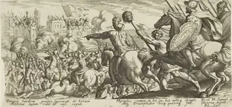 Цезарь принял командование правым флангом, где его любимый X легион вступил в тяжелый бой. Вдохновленный Цезарем Десятый легион усилил натиск и заставил силы Помпея отступить. Осознавая опасность, Гней Помпей снял один легион с правого фланга своих войск, дабы усилить левый и избежать его уничтожения. Однако как только правый фланг Помпея был ослаблен, кавалерия Цезаря начала решающую атаку, полностью изменившую ход сражения. Мавретанский царь Богуд, сражавшийся в рядах Цезаря, по своей собственной инициативе совершил глубокий кавалерийский рейд в тыл врага и напал на лагерь помпеянцев.