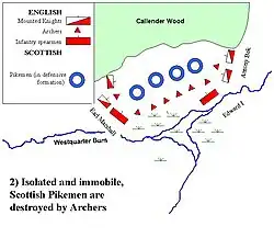 Английские рыцари прорываются через шотландских рыцарей и лучников, но останавливаются пикинёрами.