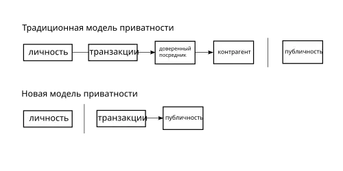 Традиционная модель приватности достигается системой ограничения доступа к информации: о транзакции будут знать только две стороны и банк. В системе «Биткойн» все транзакции публичны, хранятся в открытом нешифрованном виде со свободным доступом к любому блоку, а приватность достигается полным отсутствием в системе персональных данных владельцев биткойн-адресов[53]. Сатоси Накамото для повышения конфиденциальности рекомендовал создавать отдельные адреса для каждой транзакции. Это осложняет сопоставление адресов с конкретным владельцем.