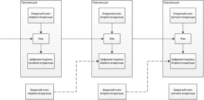 Биткойны могут быть переданы любому, кто сообщит корректный биткойн-адрес или открытый ключ. Для передачи биткойнов текущий владелец создаёт новую транзакцию, которая, помимо указаний о количестве передаваемых биткойнов, содержит подписанный инициатором хеш предыдущей транзакции, по которой биткойны были получены. Предыдущая транзакция становится «входом» текущей транзакции. Также указывается публичный ключ или биткойн-адрес нового получателя («выход») (см. схематическую структуру на рисунке). Транзакция широковещательным запросом по открытым каналам без шифрования отправляется в сеть. Остальные узлы сети, прежде чем принять транзакцию к обработке, проверяют подписи. Правильность подписи свидетельствует, что инициатор действительно является владельцем секретного ключа для адреса «выхода».