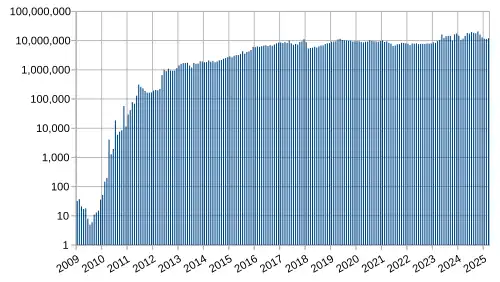 Выпуск новых биткойнов децентрализован, не зависит от какого-либо регулирующего органа, объём эмиссии известен заранее (см. график количества биткойнов до 2033 года). Стандартная порция новых биткойнов прибавляется к сумме комиссий из транзакций, включённых в очередной блок. Итоговую сумму в качестве вознаграждения получает тот, кто добавил очередной блок в базу транзакций[12].
